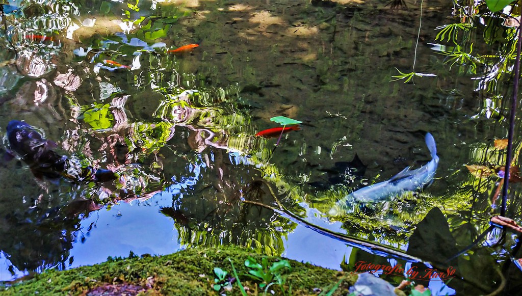 Das Geräusch sprudelndenWassers lenkt meinen Blick auf ein Wasserbecken in dem einige Fische munter herumschwimmen.