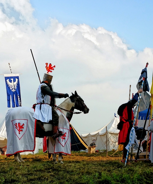 Die Ritter steigen in die schweren Rüstungen, setzten ihre Helme auf und dann geht es los. Es reiten immer zwei Ritter, rechts und links im